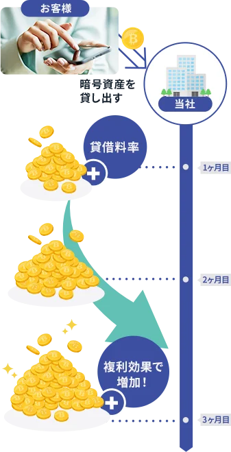 お客様が保有する暗号資産(仮想通貨)を「らくらくちょコイン」にお貸出しいただくだけで、毎月一定の利率で計算した貸借料(利息)を得ることができます。